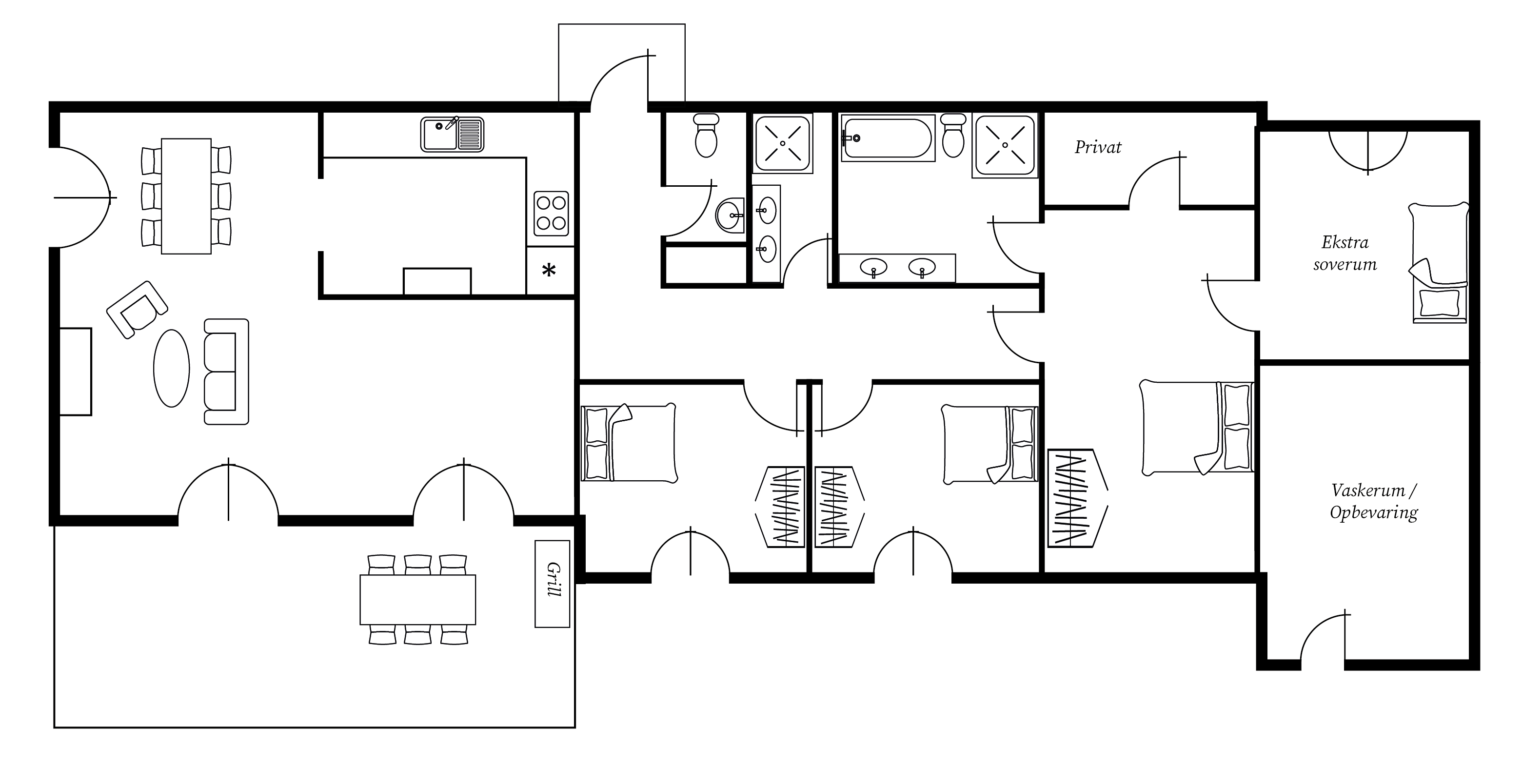 Soveværelse med eget badeværelse (toilet, badekar, 2 håndvaske og separat bruser). Gæsteværelse 1 med to enkeltsenge (2 x 90 x 200 cm) og indbygget skabsplads. Gæsteværelse 2 med to enkeltsenge på 80 x 190 cm og indbygget skabsplads. Begge værelser deler det andet badeværelse med bruser og 2 håndvaske. Hvis det ønskes, kan enkeltsengene skubbes fra hinanden. Udover de 3 soveværelser er der et fjerde rum, med to senge, der kan benyttes som soveværelse.